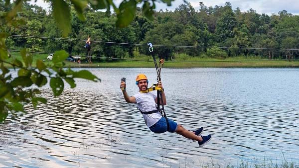Soar through the air and feel the adrenaline rush as you zip across the lush green forest.